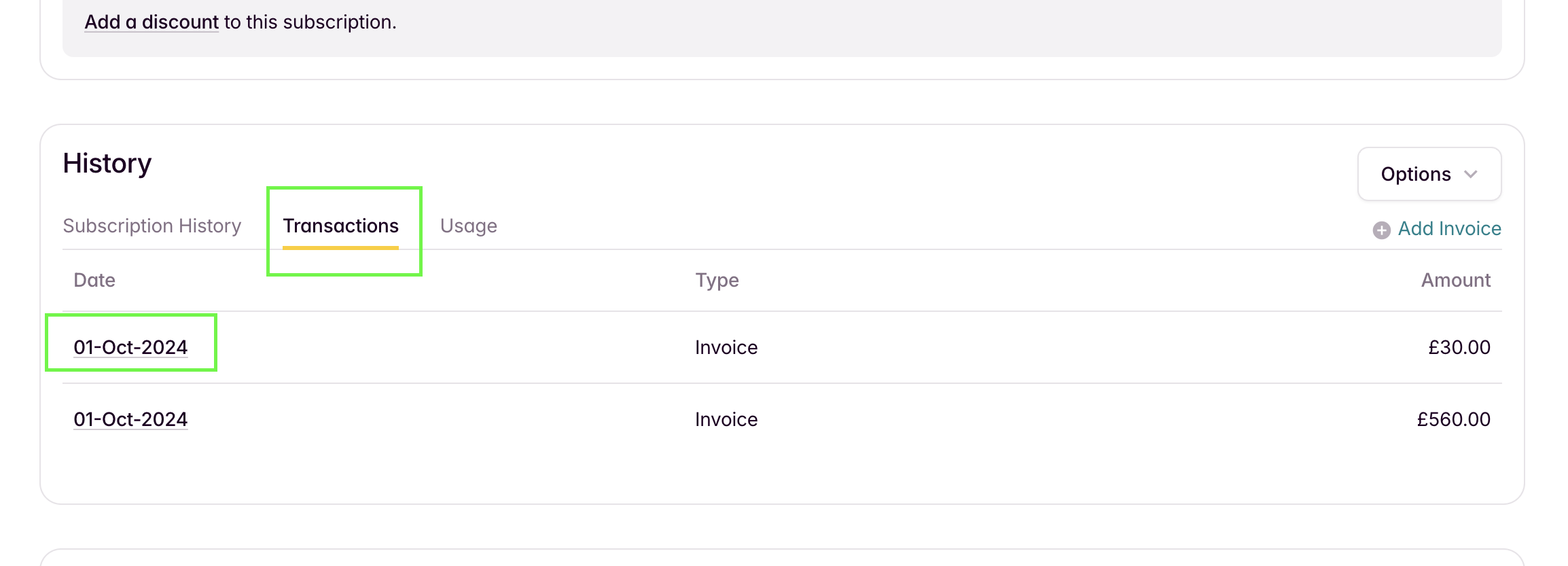 Check the transactions tab within. the 'History' pane to see what invoices have been raised. You should be able to tell from the invoice amount whether it is quarterage + donation or just one of these. If there is a transaction with a negative amount, this is either a payment or a credit and will be indicated in the 'Type' column. If a full payment has been made against the invoice, the member will need to be partially/fully refunded. See further down for instructions on that.