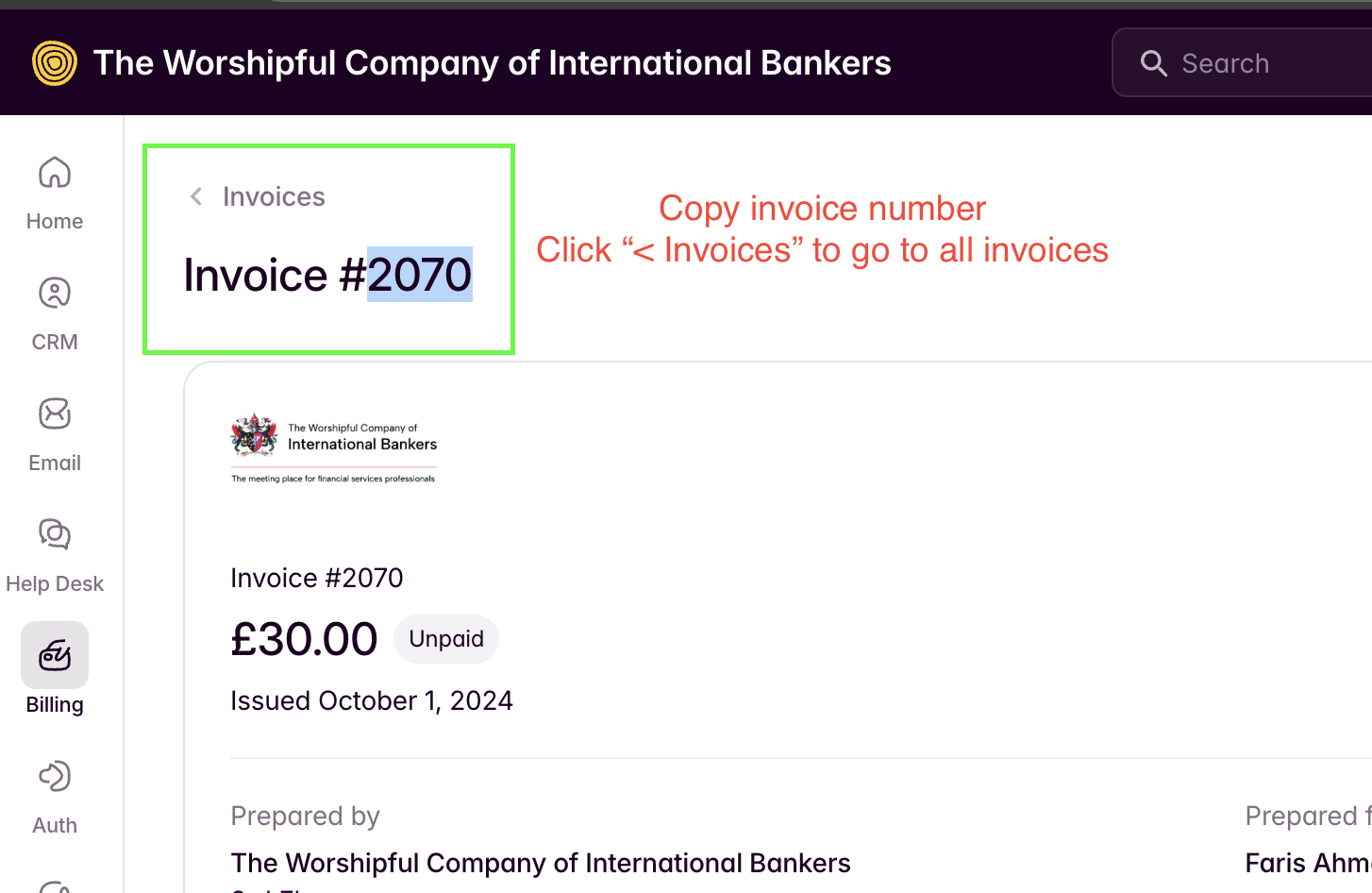 To delete an invoice, first copy the invoice number and then click on the "< Invoices" button just above it to see all invoices.