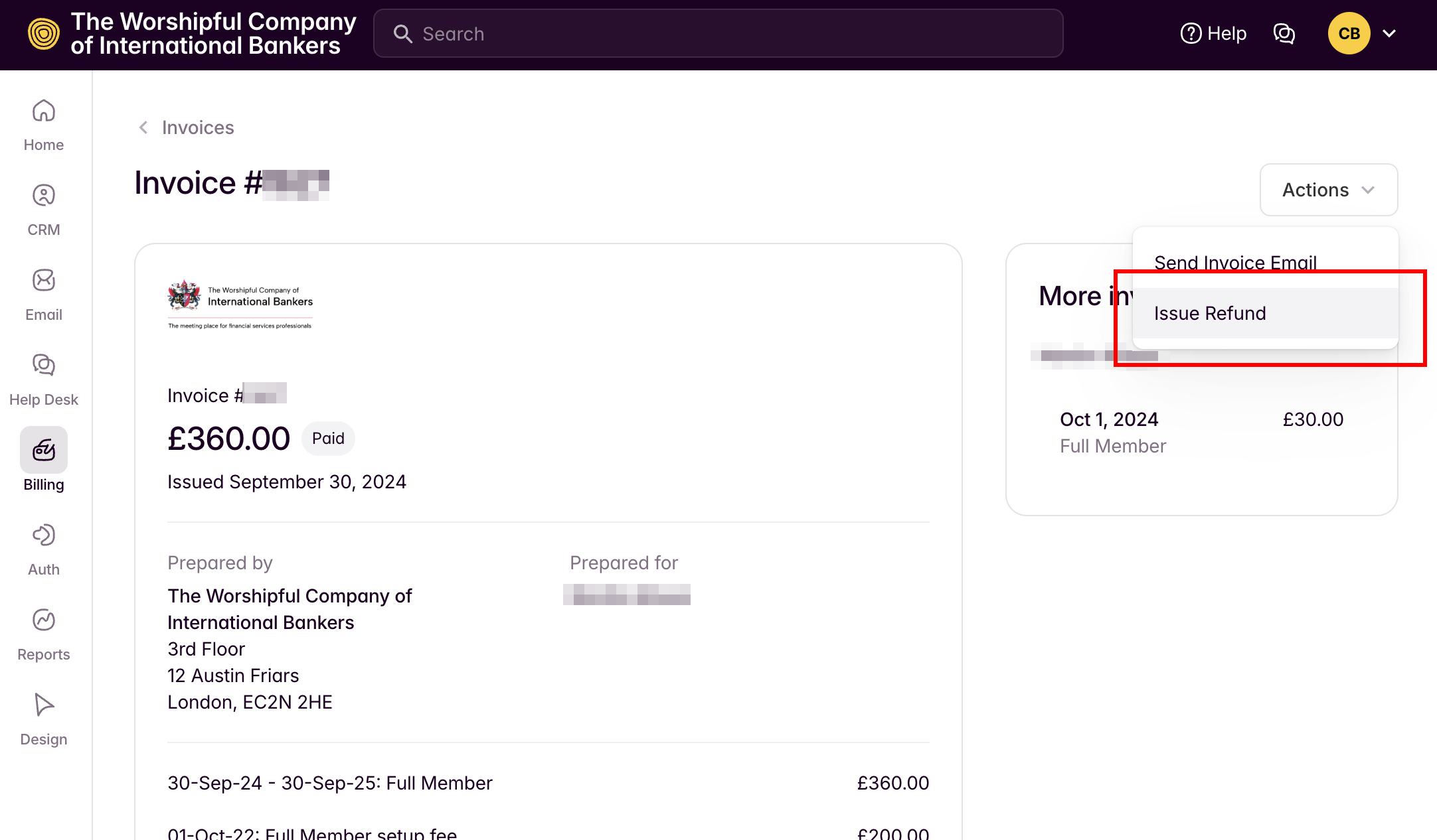 If a refund needs to be issued, click on the "Actions" dropdown and select "Issue Refund". Follow the wizard to refund the correct amount (partial or full).