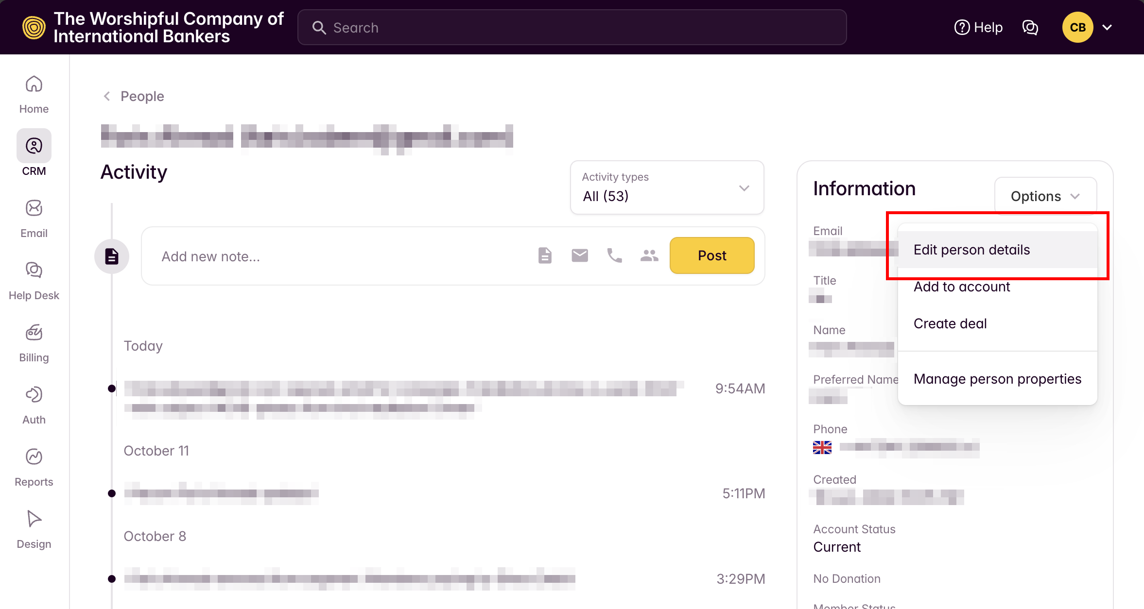 Open up their "person details" by clicking on the 'Options' dropdown and selecting 'Edit person details'.
