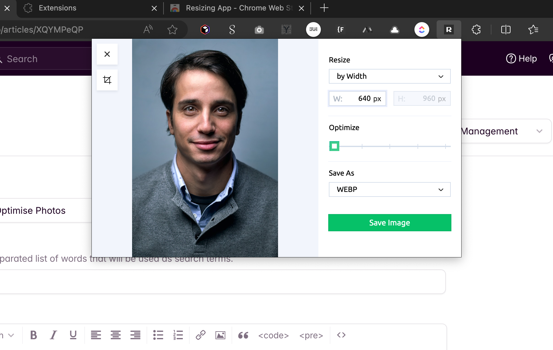 Once the image has been uploaded you can crop the image, select new dimensions and choose to Save As WEBP.